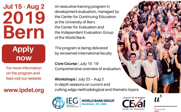El Programa Internacional para la Capacitación en Evaluación del Desarrollo (IPDET) es un programa de capacitación ejecutiva administrado conjuntamente por el Centro de Educación Continua de la Universidad de Berna (Suiza), el Centro de Evaluación de la Universidad de Saarland (Alemania) y el Grupo de Evaluación Independiente del Banco Mundial.