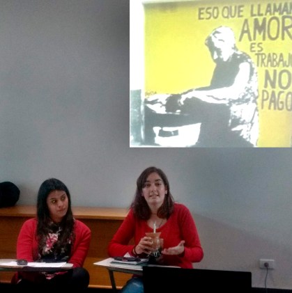 En segundo lugar, Gabriela Trad Malmod – Socióloga, militante política/feminista e integrante del espacio Sociología Feminista(s) de la UNSJ- inició su presentación con una provocadora frase de Silvia Federici: “Eso que llaman amor es trabajo no pago”. En su tesis de grado analizó el programa ‘Ellas hacen’. El mismo “actualmente ha sido vaciado de contenidos y de recursos”, afirmó. Con una gran claridad conceptual, nos invitó a pensar sobre las formas que adquieren el trabajo, actualmente, y su precarización desde una mirada feminista decolonial. Al respecto, nos dice: “Todes estamos en una situación de precariedad de alguna manera, pero esta situación nos toca muy de cerca a las mujeres y las identidades disidentes, les que vivimos las mayores precarizaciones laborales». En este sentido, señala que uno de los aportes más interesantes de movimiento feminista para pensar el trabajo tiene que ver con la ‘Economía del Cuidado’.