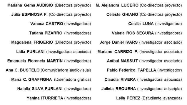 Todos nuestros proyectos cuentan con actividades de capacitación, formación y acompañamiento a iniciativas en territorio. Así, los productos de nuestro trabajo pretenden trascender la instancia de las publicaciones en libros y artículos en revistas especializadas, hacia mecanismos de socialización de saberes, extensión y transferencia de conocimientos ‘con’ y ‘para’ diferentes organizaciones sociales e instituciones públicas.